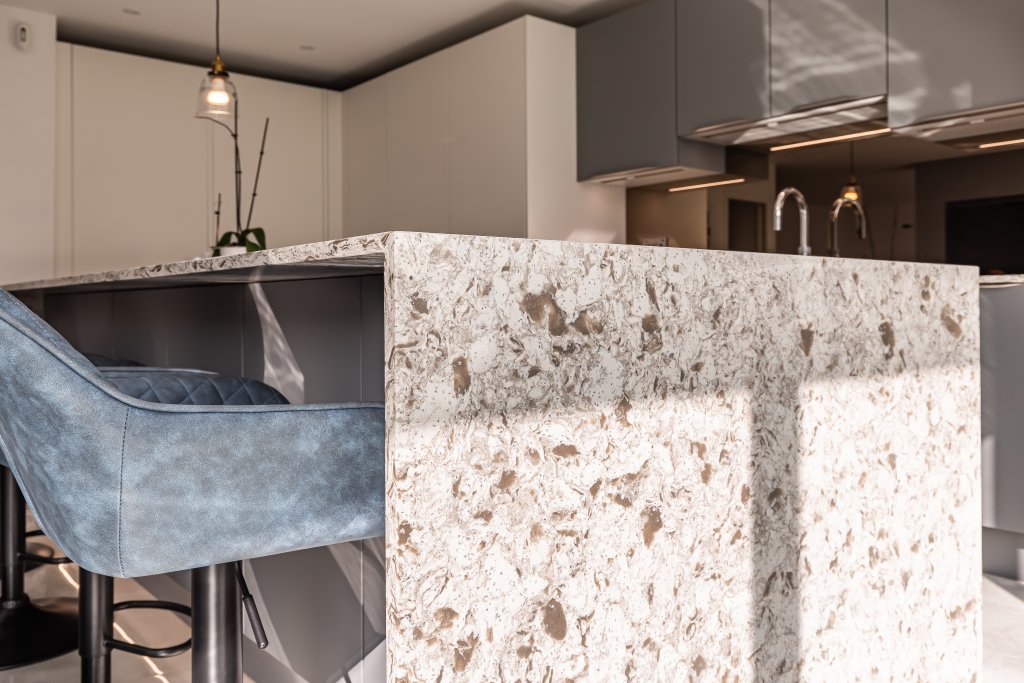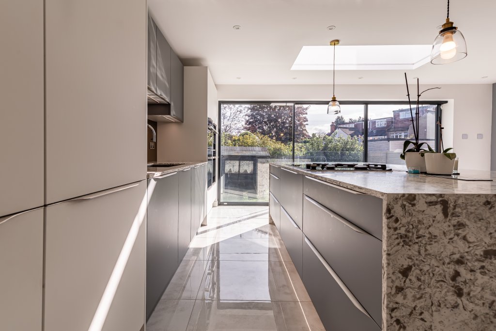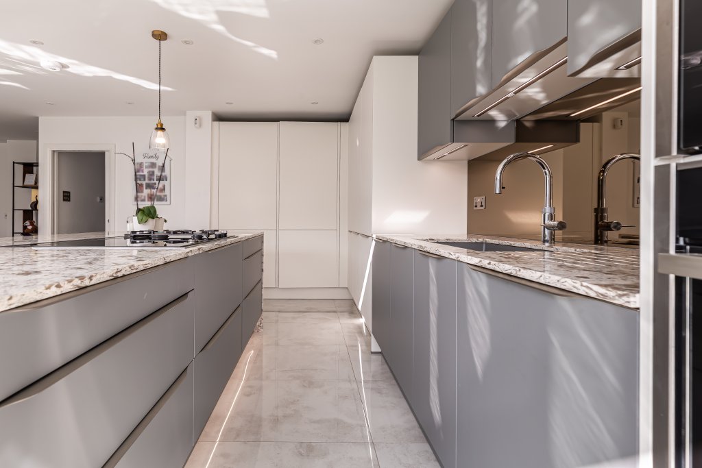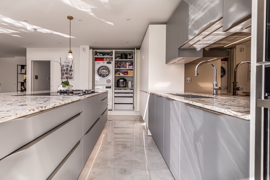 A striking two-toned kitchen, featuring white and grey door fronts in our smooth lacquered anti fingerprint finish with built-in handles. Designed for family living and entertaining, incorporating a feature island with breakfast bar seating, two pocket door systems for stacked washer/dryer and breakfast area. The kitchen features a corner walk-in storage area providing access to a boiler. The scheme is completed with an eye-catching patterned quartz, and a bronze mirror glass splashback.