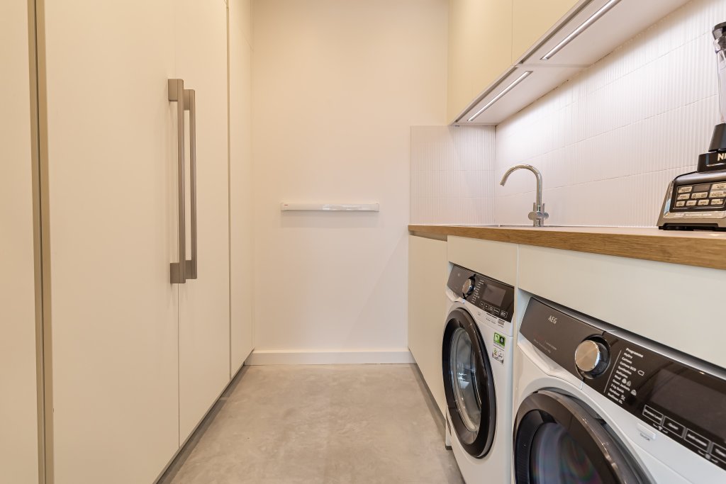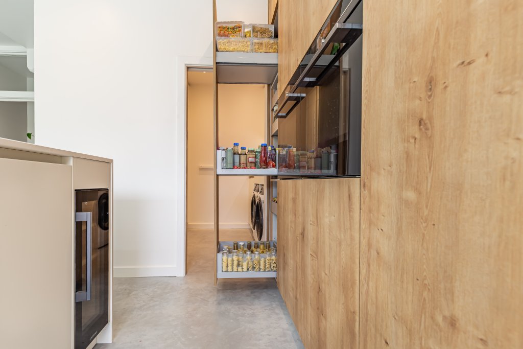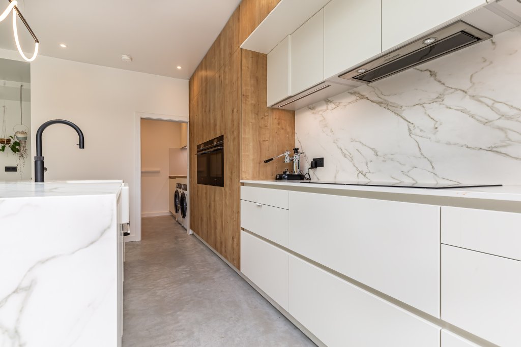 Smooth lacquered white handle-less kitchen, combined with natural oak. Designed for family living and entertaining, incorporating a feature island with wrap-around worktop and bespoke designed wall units to maximize storage space provided by the high ceilings.