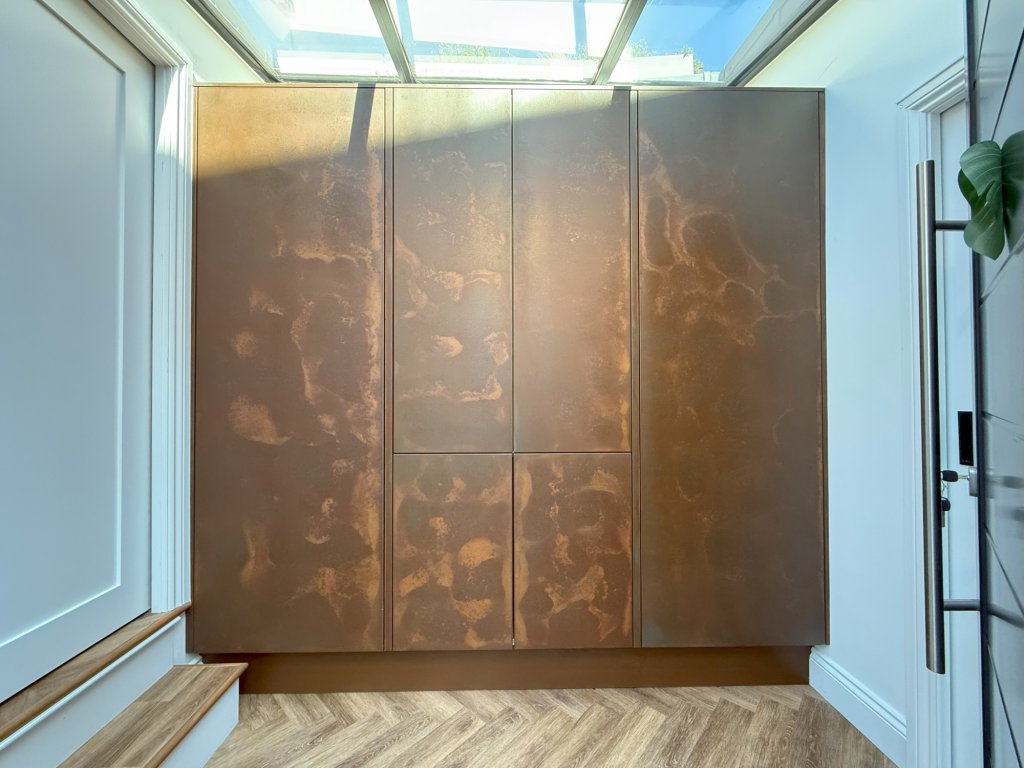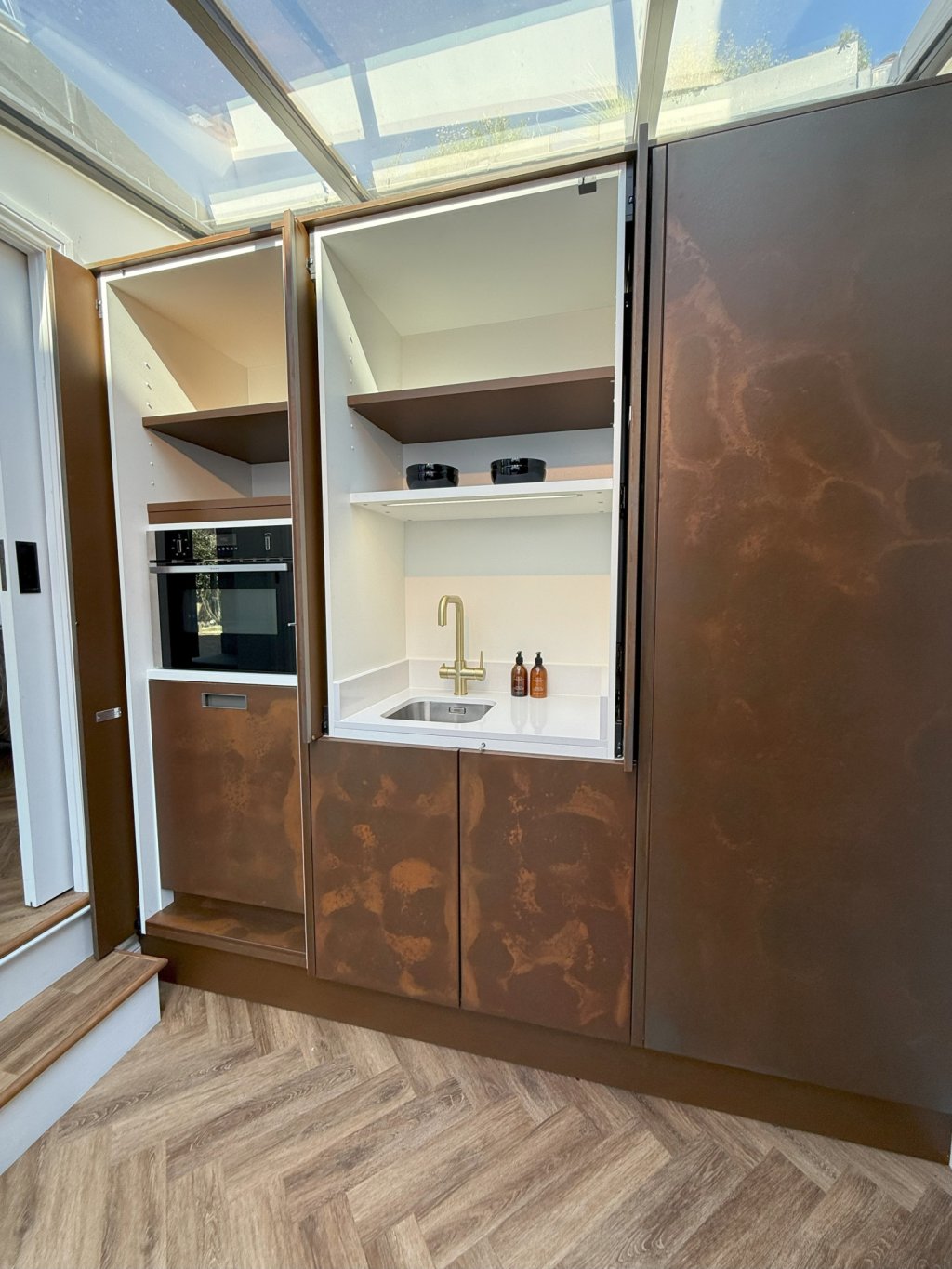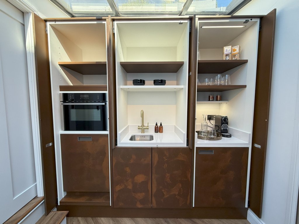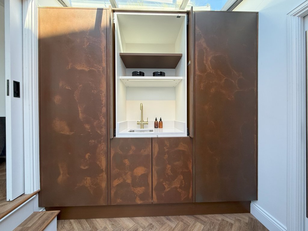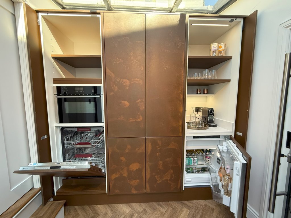 A fully-functioning discreet kitchen designed in a 2.4 metre restriced space! A hidden kitchen, designed with pocket doors, featuring door fronts in striking Bronze Stainless Steel. The kitchen incorporates a sink, boiling tap, oven, dishwasher, fridge, coffee area and display space.