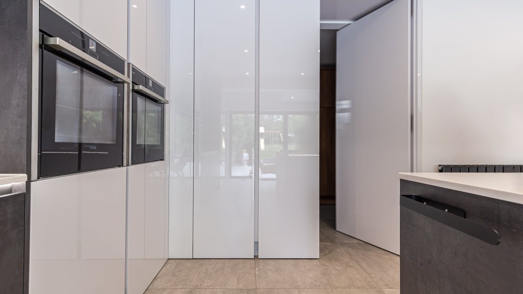 Textured grey and gloss lacquered white handle-less kitchen, designed for family living with versatile floor to ceiling storage, incorporating an island with hob and wine cooler to the rear, creating a friendly social space to engage with either family or guests whilst cooking. Featuring tall units with doors extending to floor, larder storage with pull-out tray for small appliances and 'secret' door to pantry.